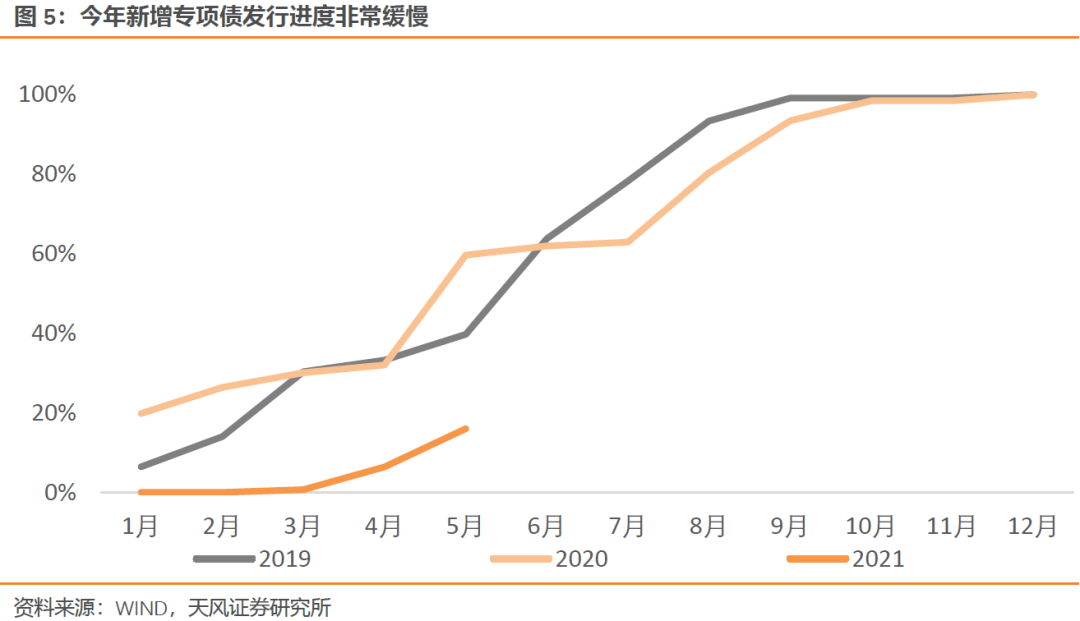 1-5月,地方新增专项债发行仅5840亿,占全年额度3.65万亿的16%;相比之下,2019和2020年的同期进度为39.8%、59.7%。新增一般债的发行进度高于专项债,但也稍慢于19-20年同期。总的来看,5月地方债发行规模既低于市场预期,也低于地方披露规模。