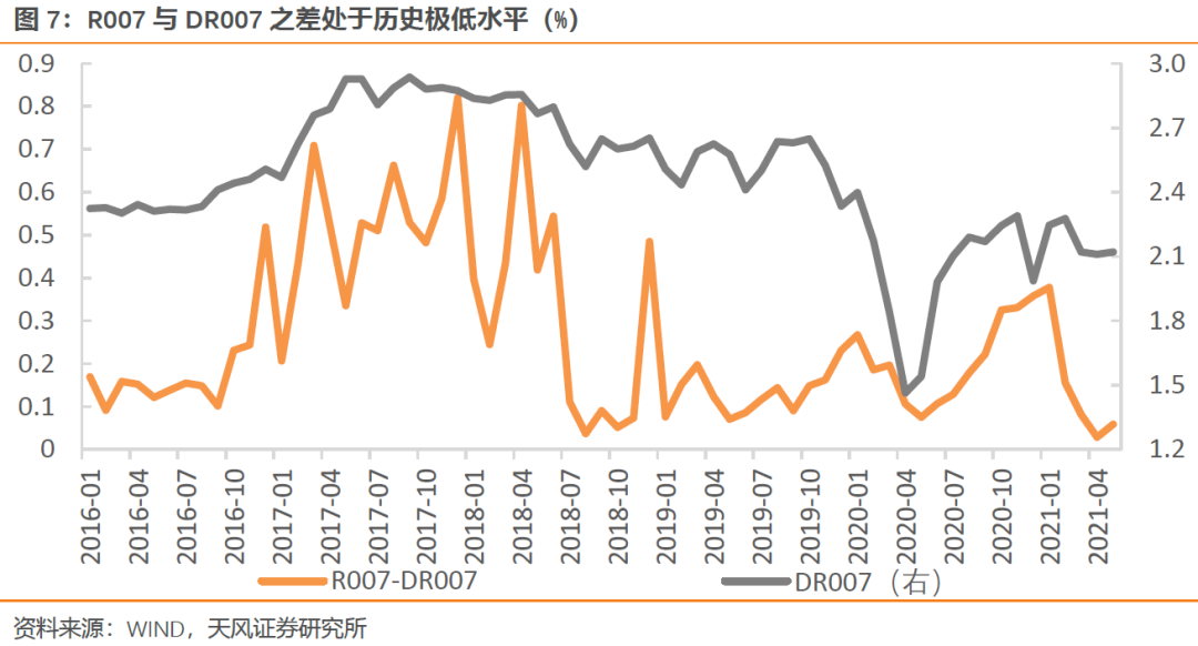 流动性缺口不意味着资金面必然收紧,根本上取决于央行的政策意图和投放力度。6月正处于资金面和金融稳定的窗口期,金融稳定在政策目标中享有较高权重。因此,短期内央行主动引导流动性明显收紧的概率不大,后续将加大公开市场操作力度,结果是DR007反映的存款类机构流动性价格中枢基本稳定或小幅上行,波动率可能有所上升,R007相比之下更平稳。时点上,央行不加大投放意味着流动性缺口尚不明显,加大投放力度反而说明缺口出现,届时资金面波动可能有所加大,流动性最宽松的阶段也将随之告一段落。