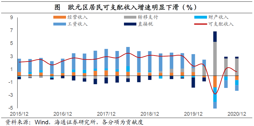 通胀分化的背后是二者刺激模式和力度的不同,美国高强度“发钱”模式大幅提高了居民收入,欧洲虽然也给居民“发钱”,但力度没有美国那么大,居民收入增速下滑,欧、美的消费能力出现分化。