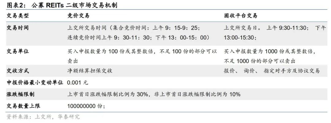 交易机制:公募REITs投资者以银行、保险等机构投资者为主,因此从投资者偏好角度出发,公募REITs同时在上交所固收平台交易,基本要素除交易时间、交易单位和交收方式外与竞价一致。交易单位方面,基础设施基金采用竞价交易的,单笔申报的最大数量应当不超过1亿份;基础设施基金采用竞价交易的单笔申报数量应当为100份或者其整数倍;采用询价和大宗交易的,单笔申报数量应当为1000份或者其整数倍。申报单位方面,基础设施基金申报价格最小变动单位为0.001元。涨跌幅限制方面,基础设施基金上市首日涨跌幅限制比例为30%,非上市首日涨跌幅限制比例为10%,交易所另有规定的除外。基础设施基金涨跌幅价格的计算公式为:涨跌幅价格=前收盘价×(1±涨跌幅比例)。
