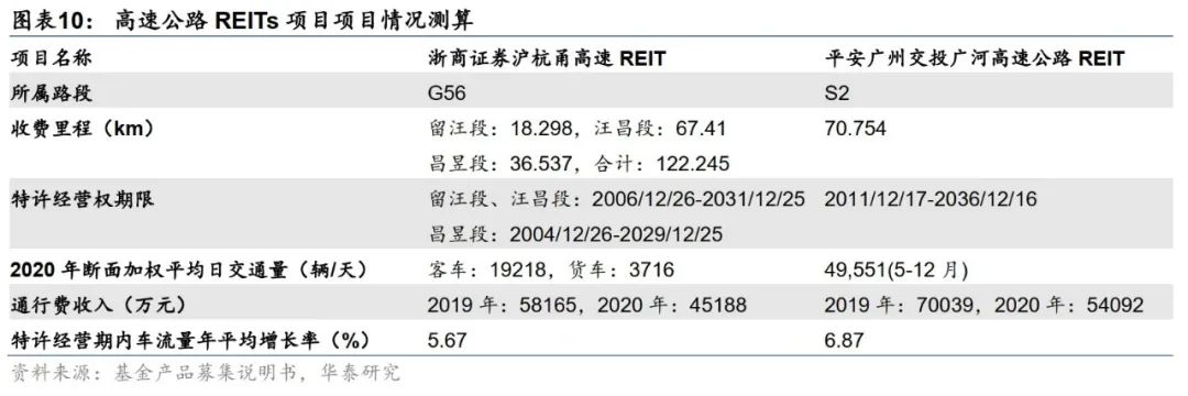 具体来看,首批公募REITs项目中两个底层资产为高速公路的项目所属地理位置优良,区域经济发展水平较高,车流量增长率可观,且公路维护成本相对可控。杭徽高速公路(浙江段)是国家高速公路网G56杭瑞高速的重要组成部分,沿线地区经济发展状况良好、旅游资源丰富,车流量增长率较为可观,且地处自然环境较为平和、过路车流以客运车为主,公路维护成本相对可控,目前特许经营权期限剩余时间在10年左右;广河高速(广州段)是广东省境内连接广州市、惠州市与河源市的广州至河源高速公路的广州段,属于基础设施补短板行业中的收费公路基础设施,位于粤港澳大湾区,属于优先支持的重点区域。2015年底竣工后,经过几年的发展已经积累了一定车流量,预计在未来“一带一路”经济发展及基础设施产业政策扶持下车流量还会有所增长,目前剩余特许经营权期限为15年,根据招募说明书测算收益能够超额覆盖公路建设与维护成本。