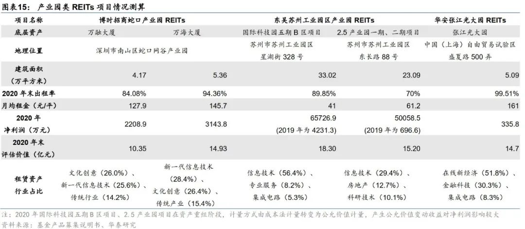 苏州工业园区产业园项目位于苏州东部休闲度假景区和产业园聚集地,属于工业类产业基础设施建设项目。国际科技园五期B区项目位于独墅湖景区附近、更靠近苏州市主城区,相应产业园出租率更高,净利润水平更为可观。行业集中在信息技术业,并依托周围景区与高校资源,人口与产业聚集程度较高,资产有较大的增值空间。产业园项目位于苏州工业园区东北部,距离苏州主城区较远,该区域尚处于发展规划初期阶段,因此出租率和利润水平相对较低,需要根据相关基础设施建设配套程度、区域人口密度的增长潜力、产业发展定位和项目运营提升潜力来判断未来现金流稳定性和底层资产的升值空间。