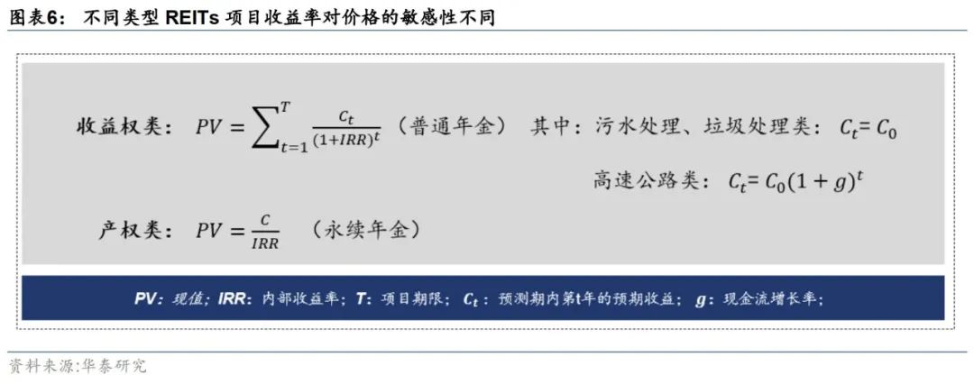 产品运行特征将表现出明显差异,底层资产的属性和质量是决定项目现金流来源及投资价值的基础。收益权类项目的投资价值是主要来源于运营期间的收益,产权类项目投资价值还包括了资产本身价值的增长。同时,底层资产质量、所属的行业的周期性以及对经济增长的敏感性也会影响现金流的稳定性,进而影响产品自身的风险收益水平,需要关注特定项目股性强还是债性强。此外,市场操作中,投资者还会关注底层项目的周期性、经营和政策等风险要求不同的风险溢价,需要具体分析影响其现金流及估值的核心要素。