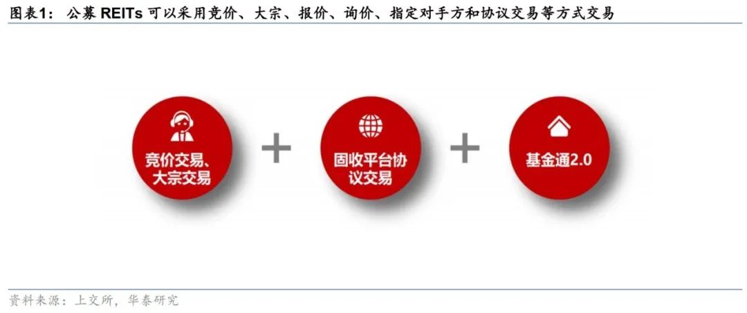 交易方式:基础设施基金可以采用竞价、大宗、报价、询价、指定对手方和协议交易等交易所认可的交易方式交易。基础设施基金竞价、大宗交易适用基金交易的相关规定,报价、询价、指定对手方和协议交易等参照适用债券交易的相关规定,交易所另有规定的除外。
