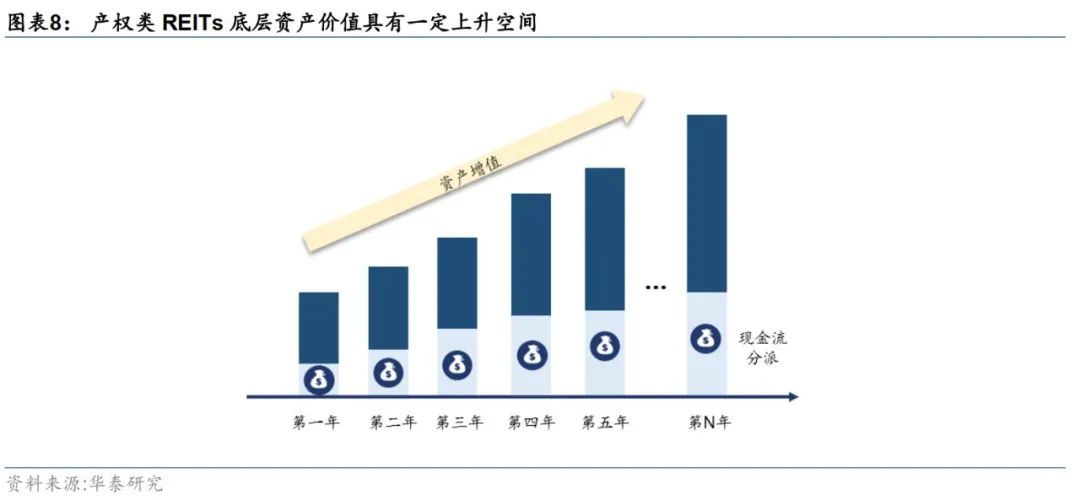 4、公募基金配置低于预期,目前多通过专户参与。短期实施层面,公募基金需要修改现有产品的投资范围并通过内部流程方可投资REITs,目前多通过专户参与,造成首批产品认购偏低。不过,配置角度看,无论是产权类资产的天然固收+属性(派息+产权看涨期权),还是特许经营类的类固收属性,优质项目对公募而言也具备较强吸引力。因而中期来看,公募更多参与REITs市场仍是大势所趋,有望成为重要增量资金源;