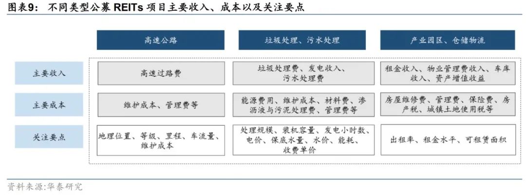 最后,每个项目存在个体差异性,需要具体关注影响其现金流及估值的核心要素。底层资产为高速公路的项目主要收入来源于高速过路费收入,主要成本是公路的维护和管理费用,需要重点关注高速公路所处的地理位置、周边竟品质量、公路自身等级和里程,同时需要关注区域经济周期对车流量带来的影响。垃圾处理和污水处理类项目收益主要来源于垃圾处理收费、发电电费收入和污水污泥处理费收入,需要重点关注其处理规模、装机容量、发电小时数、电价、保底水量、水价、能耗及收费单价,同时中长期的环保产业政策与政府补贴力度也会对项目收益产生一定影响。产业园区和仓储物流类项目收入最主要来源于租金收入,成本涉及的房屋的维修费用、管理费用以及与不动产相关的税费,最核心关注点在于其不动产的出租率、租金水平和可租赁面积及资产价值成长性,因此还需关注其资产的区位因素、产业聚集程度和供求关系。