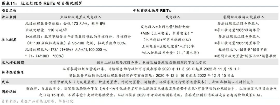 垃圾处理和污水处理两个环保类项目受市场周期影响较小,同时具有一定政策保障,现金流稳定性较高。其中,首创水务等龙头企业,其收入端垃圾处理费、电价、水价、污水污物处理单价在行政要求下或可在较长期限内保持稳定,处理量相对稳定,不易受经济周期及市场竞争环境的影响;招募说明书中估值预期未来收入规模保持不变,但考虑到未来环保行业的发展趋势和原始权益人自身的行业地位,收入水平或可实现小幅度的增长。成本端主要在于飞灰处置费、炉渣处置费、污泥处置费、运输费、环保系统运行费等运营成本、以及折旧和摊销以及材料支出,且生活垃圾及污水处理过程中对环境造成的影响也相对可控,因此其成本相对可控。此外,环保行业项目还需关注政策的倾斜力度,财政部、发改委、国家能源局联合下发《关于<关于促进非水可再生能源发电健康发展的若干意见>有关事项的补充通知》(2020年10月)规定生物质发电项目自并网之日起15年后不再享受中央财政补贴资金。需要关注国补退坡后是否会有其他的政策补贴对项目收益产生的影响。