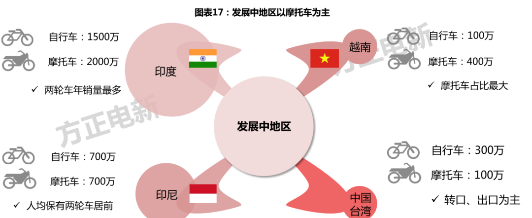 1、对比自行车、摩托车,电动两轮车出海空间大