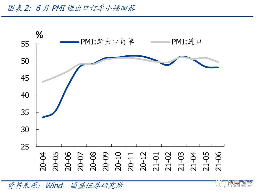 2)进出口订单均小幅回落,下半年出口预计高位放缓、总体仍强。6月新出口订单继续小幅回落0.2个百分点至48.1%,连续2个月处于收缩区间;除了前期报告《5月PMI的喜与忧》中提到的汇率、运价、原材料涨价三重压力外,近期广东疫情对盐田港等港口运行的干扰也不容忽视;往后看,下半年出口依然乐观,但受海外经济修复放缓、生产逐步恢复影响,预计出口将较上半年高位放缓。6月进口订单回落1.2个点至49.7%,可能与生产放缓导致制造业生产用原材料进口量有所减少有关。