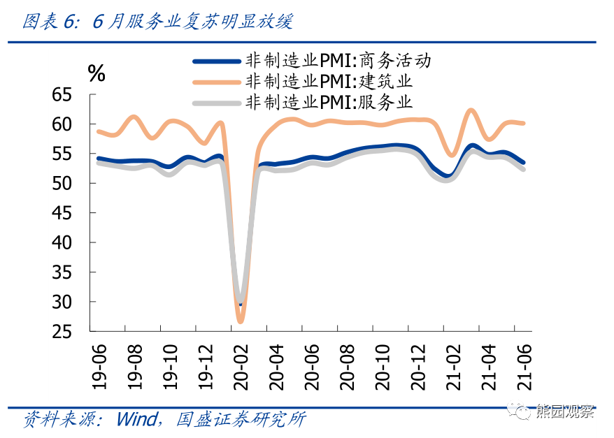 1)需求修复,供给放缓,纺服、医药景气大升。6月PMI生产指数、新订单指数为51.9%、51.5%,分别较上月变动-0.8、0.2个百分点。供给端,工业生产有所放缓,主因芯片、煤炭、电力供应紧张及设备检修等因素拖累;需求端,整体修复小幅加速,尤其是新订单指数在新出口订单回落的拖累下仍小幅回升,反映内需修复较强,与6月消费品制造业PMI明显上行相互印证,可能是受市场需求回暖及年中促销等带动。分行业看,纺织服装、医药行业产需增长较快,景气度均高于上月;医药行业景气回升,可能与全球Delta变异病毒迅速蔓延有关。纺服行业景气度明显提升,可能同时受益于出口高景气(替代东南亚生产、欧美服务业复苏)和国内可选消费复苏,验证了我们中期报告《分化下的预期差—2021年中期宏观经济和资产配置展望》中的观点。