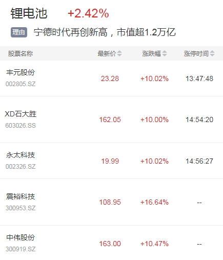 此外,带动锂电池板块多只个股涨停。