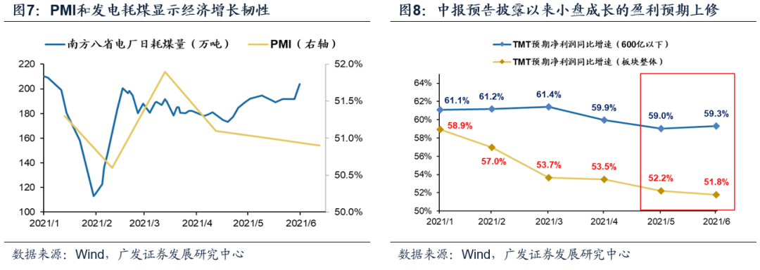 (三)小盘成长的盈利预期转向上修。当前中国经济动能减弱、韧劲仍存——(1)宏观景气:6月PMI为50.9%,在工业淡季回落0.1%,依旧处于“荣枯线”以上;(2)中观景气:6月南方八省日均耗煤量204万吨,环比上月末增长5.2%,基本符合季节性;(3)微观盈利韧劲:5月工业企业利润增速83.4%(4月106.1%),两年复合增速21.7%(4月22.3%)。中报业绩(预告)逐步披露,小盘成长的盈利预期转向上修——我们基于分析师重点跟踪公司(5家及以上机构覆盖)构建A股预期净利润数据库(详见每周发布的《A股全动态估值周报》)。年初以来,科技成长股的盈利预期持续下修,但随着6月中报业绩(预告)逐步披露,市值在600亿以下的中小盘成长股的盈利预期开始转向上修,而部分顺周期行业(汽车、公用事业、地产等)的盈利预期则有所下修。
