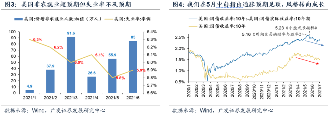 虽然A股微观结构仍存在调整压力,但我们认为本轮热门股的调整幅度会远小于2-3月份——(1)2月全球疫苗接种加速提升全球经济增长预期,美国通胀预期和美债实际利率共同向上驱动美债名义利率快速上行,对A股形成“压力测试”;而当前全球经济增长处于顶部区域,美国通胀预期见顶回落,未来即使实际利率向上驱动名义利率,其幅度也相对有限。同时,周五公布的美国新增非农就业85万人远超预期,但失业率数据依旧维持在5.9%的相对高位,美债名义利率继续下行。我们维持6.14中期策略《量价突破》中“美债10年期利率难以达到主流预期的2%”的判断。(2)2月市场广度显著下降,以茅指数代表的热门股极端化;而当前经历了2月以来的“微观结构调整”、“市值下沉”之后,市场的广度已经明显提升。
