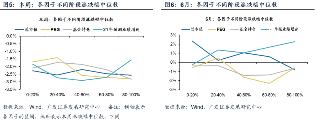 (二)中报期临近,预期业绩因子的重要性提升。近期A股多项交易因子的表现,显示微观结构调整后“市值下沉+即期业绩好+低PEG”策略占优——(1)市值下沉:大市值因子的表现弱于其他因子(6月最差,本周排名第二),且小市值公司相对大市值公司取得比较显著的超额收益;(2)即期业绩好:业绩因子的表现显著优于其他因子(6月和本周排名均第一),且业绩增速高的公司也取得较为显著的超额收益;(3)低PEG:高PEG因子的整体表现较差(6月和本周排名均靠后),而低PEG因子的表现更优(本周排名第一),且PEG低的公司的超额收益也更为显著。这进一步验证微观结构调整后低PEG策略“牛市不跑输/熊市更占优”的特征。我们也观察到:随着中报期临近,业绩因子也从6月的即期业绩(一季报利润增速)占优,转向本周的预期业绩(21年预期利润增速)占优。由此可见,在当前的中报“将披露但未完全披露”的窗口期,投资者将更关注盈利预期(上修/下修)的变化。