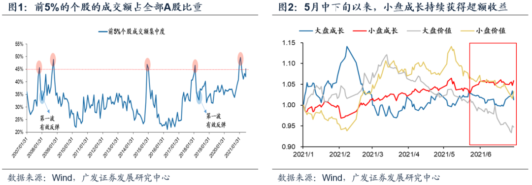 (五)2月冲击难以重现,利用调整继续配置“市值下沉”、“小盘成长接棒”。当前A股前5%个股成交额占比再次触及45%阈值,微观结构仍有调整压力,但我们判断本轮热门股的调整幅度会远小于2-3月份: