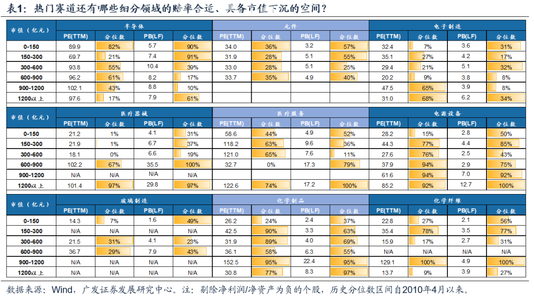 (2)配置的赔率角度:选择估值合适、仍有市值下沉空间的细分赛道。按市值区间将各细分行业划分为6档,选择其中大小市值估值分化、大市值估值高位而小市值仍相对便宜,有较大可能开启市值下沉的细分赛道。在以上筛选结果的基础上,结合此前对于胜率的判断,最终选出胜率较高且赔率合适的投资方向主要有:医疗器械、电源设备、以及玻璃、化学制品和化纤等行业。