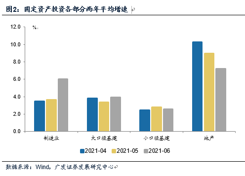 固定资产投资两年平均增长4.4%,高于5月的4.2%和4月的3.9%。从结构上看,制造业投资增速显著加快,基建则略高于上月,而地产投资减速。