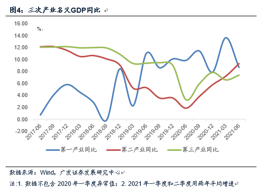 二季度实际GDP两年平均增速为5.5%,较一季度的5.0%进一步恢复。其中第二产业(工业和建筑业)名义和实际GDP两年平均增速分别为9.3%、6.1%,快于一季度的7.2%和6.0%;第三产业名义和实际GDP两年平均增速分别为7.4%、5.1%,快于一季度的6.6%、4.7%。在防控常态化影响居民生活半径的背景下,第三产业恢复程度仍相对偏低,速度偏慢,和疫情前有明显差距,未来仍有空间。