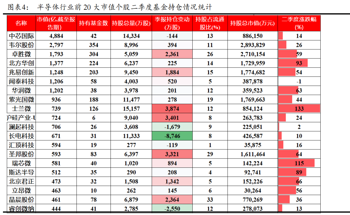 根据基金中报显示,二季度主动型权益类基金对于半导体的总持仓市值达到历史新高的1953.58亿元,配置比例达到5.62%,较一季度环比提升1.61个百分点,这一提升幅度也是除了2020年四季度以外的历史第二大值。