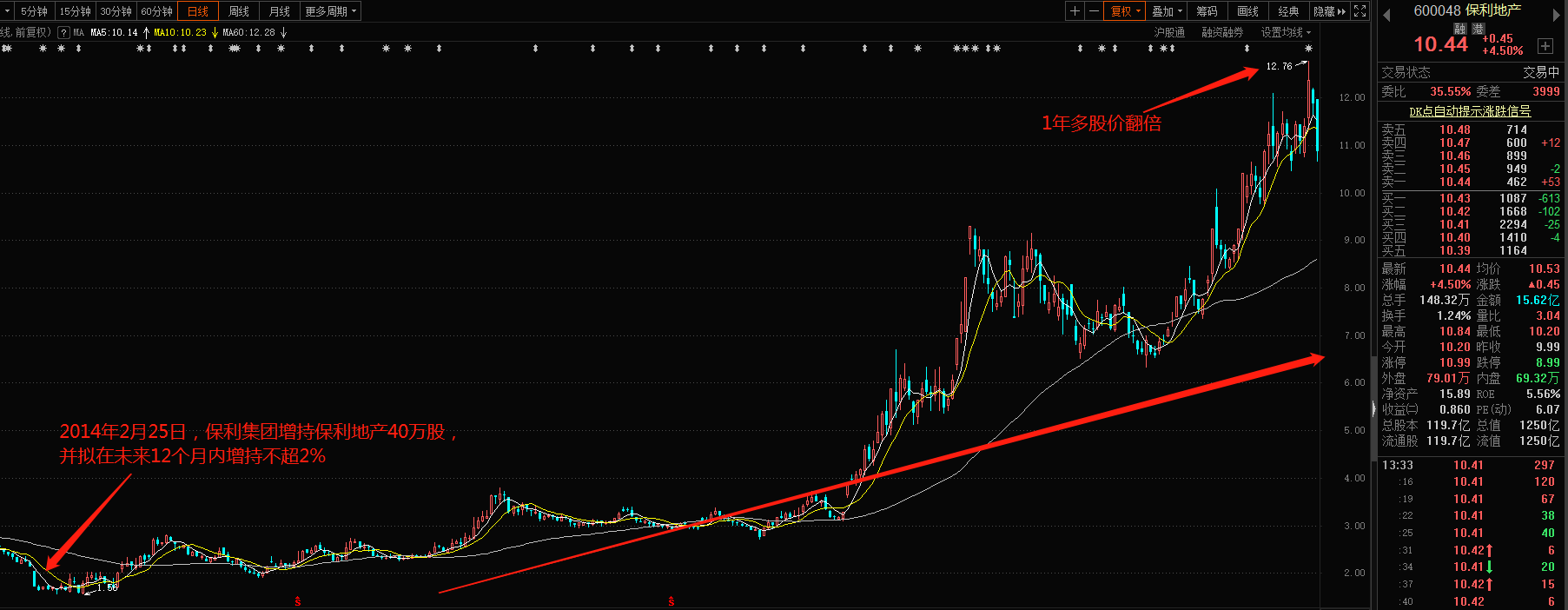 对于此次增持,有集思录网友提出,在历史上保利集团的两次增行为中,金额皆为2亿元、后续增持比例也均为2%,而在公告后一年保利地产股价都已翻番,其猜测历史或存在重演的可能性。