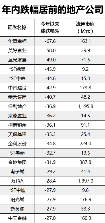 此背景下,地产上市公司自年初以来表现普遍较为颓势,在申万一级地产行业中,共有101只个股录得负收益,占比超过73%,其中跌幅超过30%的有14只,超过10%的有66只。