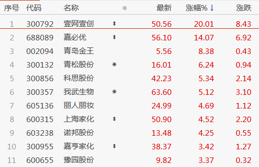 8月9日,化妆品板块大涨,壹网壹创20CM强势涨停,嘉必优涨超14%,青松股份、上海家化等也纷纷跟涨。
