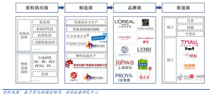 化妆品产业链大致分为原料供应、生产制造、品牌、营销、渠道等环节。化妆品代工处于行业中上游,该环节价值占化妆品终端价格10%左右。