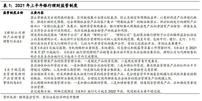 在银行理财监管政策脉络持续完善的过程中,兼顾资管业务规律与理财特色的监管制度体系逐步完善。2021年上半年,监管部门在资管新规确立的行业顶层管理框架下,制定了一系列补充与细化的资管行业监管制度:一是先后出台《理财公司理财产品销售管理暂行办法》《关于规范现金管理类理财产品管理有关事项的通知》等理财业务监管制度,进一步规范理财产品销售行为,明确现金管理类产品监管标准。二是加强内控合规管理和银行保险机构公司治理,组织开展银行业保险业“内控合规管理建设年”,夯实银行保险机构稳健合规经营根基。三是持续通过发挥监管政策引导作用,推动银行保险机构发展绿色金融,在促进生态文明建设和经济社会发展全面绿色转型方面,取得积极成效。四是强化消费者保护,加大对违规展业机构的通报与处罚力度,对违法违规行为查处情况开展通报。