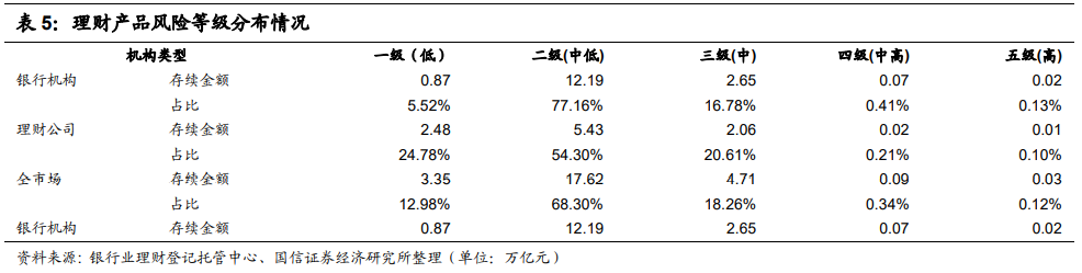 相比于银行机构,理财公司理财产品风险等级分布相对均衡。银行机构存续的风险等级为二级(中低)的理财产品占比达77.16%,高出理财公司22.86个百分点;理财公司存续的风险等级为三级(中)、一级(低)的理财产品占比分别为20.61%、24.78%,分别高出银行机构3.83个百分点、19.26个百分点。
