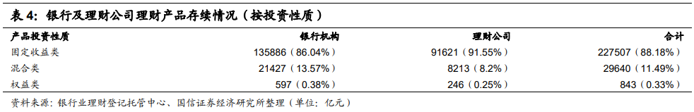固定收益类理财产品存续规模及占比持续增加。截至2021年6月底,固定收益类理财产品存续余额为22.75万亿元,较年初增长4.31%,同比增长15.04%,占全部理财产品存续余额的88.18%;混合类理财产品存续余额为2.96 万亿元,较年初下降25.44%,同比下降35.89%,占全部理财产品存续余额的11.49%;权益类理财产品存续余额为843亿元,较年初增长10.15%,同比增长1.54%,占全部理财产品存续余额的0.33%;商品及金融衍生品类理财产品规模较小,为11亿元。