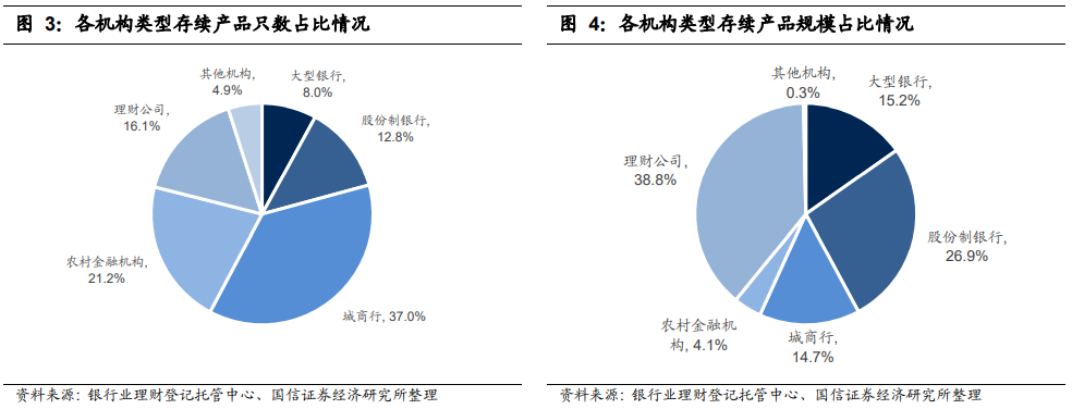 经过两年的高速发展,理财公司已经超越股份制银行,成为存续理财产品规模最大的机构类型。截至6月底,全国共有325家银行机构和20家理财公司有存续的理财产品,共存续产品3.97万只,同比减少4130只,较年初基本持平;存续余额25.80万亿元,同比增长5.37%,较年初下降0.23%。