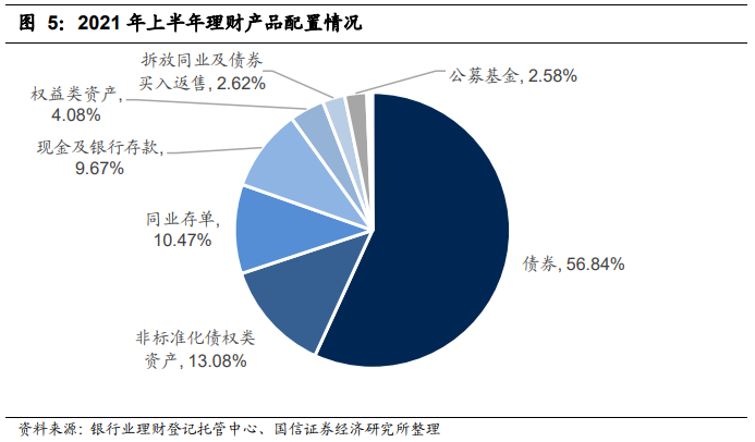 截至2021年6月底,理财产品投资资产合计28.66万亿元,同比增长2.31%;负债合计2.78万亿元,同比下降18.20%。理财产品杠杆率110.74%,较去年同期减少3.06个百分点。理财投向债券类、非标准化债权类资产、权益类资产余额分别为19.29万亿元、3.75万亿元、1.17万亿元,分别占总投资资产的67.31%、13.08%、4.08%。此外,银行理财持有现金及银行存款2.77万亿元。