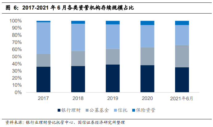 经过近20年发展,银行理财产品已成为我国资管行业乃至整个金融行业重要的有机组成部分。与公募基金、信托、保险资管等其他类型资管产品相比,银行理财产品的投资者覆盖面广,且存续规模居各类资管产品首位(其中信托数据截至2021年3月,保险资管数据截至2021年5月)。