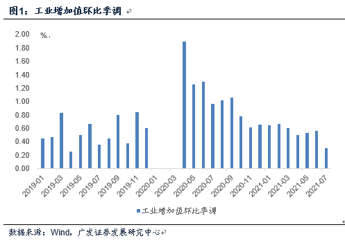 2019年工业增加值环比季调年均值为0.55%,如果我们把这一水位当作一个均线,2021年7月的0.3%属于2020年3月疫后修复以来工业增加值环比季调值首次回落至均线以下。2021年1-3月工业增加值环比季调分别为0.64%、0.66%、0.60%;4-6月分别为0.50%、0.53%、0.56%。