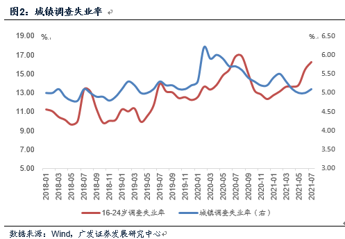 7月16-24岁人口调查失业率为16.2%,2018-2020年7月,这一口径数据分别为13.3%、13.9%、16.8%。本月数据属季节性走高,但绝对水平已显著高于疫情前。