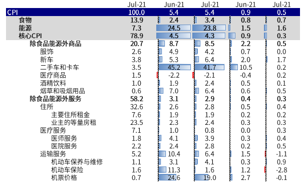 图表: 从7月的通胀分项来看,前几个月推动通胀最主要的二手车环比大幅回落