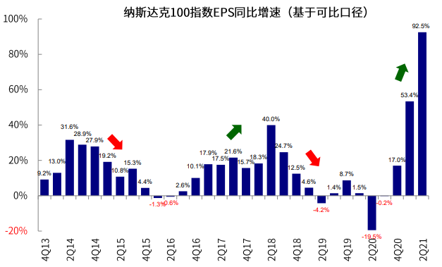 图表: 纳斯达克100指数二季度EPS同比增长92.5%,同样较一季度的53.4%继续改善