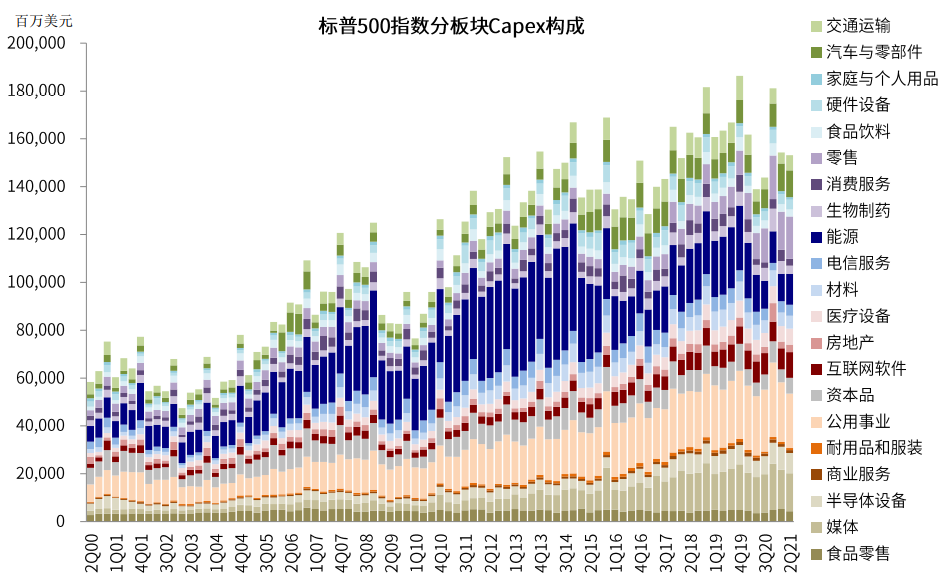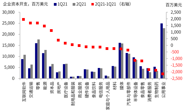 二季度标普500指数capex增速虽然看似很高,但更多是低基数所致,如果看绝对规模的话,二季度的capex反而较一季度回落,这与盈利和需求的大幅增长明显不匹配,其中公用事业、生物制药、消费者服务等较一季度回落最明显。