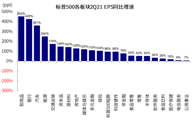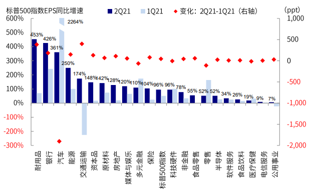 二季度耐用消费品、银行、汽车等板块EPS同比增速超过350%,这其中既有低基数的效应,也与强劲增长需求有关。
