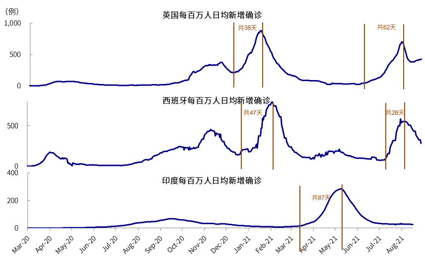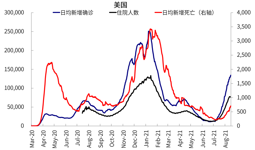 图表: 受delta变异病毒影响,美国三季度疫情再度反弹,日度新增确诊达13.4万人