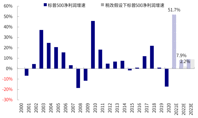 图表: 若加税措施通过并于2022年实施,我们测算将拖累标普500指数2022年预期净利润5.7%,增速将从当前市场预期的7.9%降至2.2%