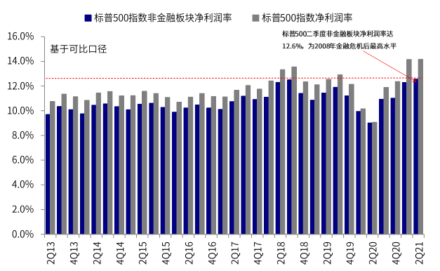 图表: 可比口径下,标普500指数二季度非金融板块净利润率攀升至12.6%,为08年金融危机后最高水平
