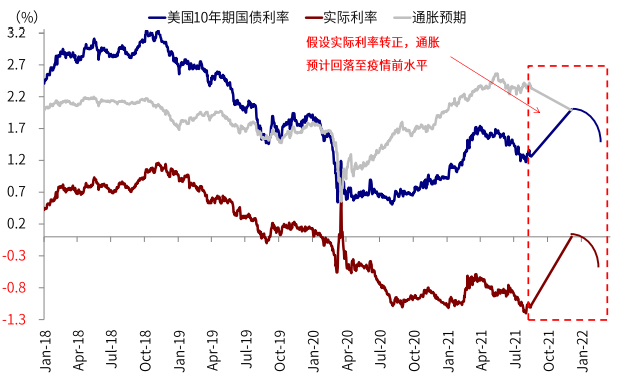 图表: “往前看”的特点使得再通胀甚至滞胀交易已经过去,长端国债利率中隐含的通胀预期也将逐步回落