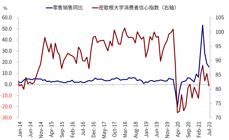 图表: 8月密歇根大学消费者信心指数意外下降,7月零售销售环比较前月同样回落