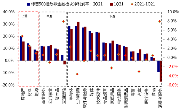 具体来看,二季度标普500指数非金融板块收入同比增速达26.4%,较一季度的10.8%抬升明显,这与二季度美国名义GDP的改善趋势一致。利润率上,二季度净利润率攀升至12.6%,为2008年金融危机以来最高,边际上看,部分中下游行业如生物制药、汽车、家庭用品的净利润率二季度小幅回落,但包括房地产和原材料在内的上游行业的利润率扩张较高。