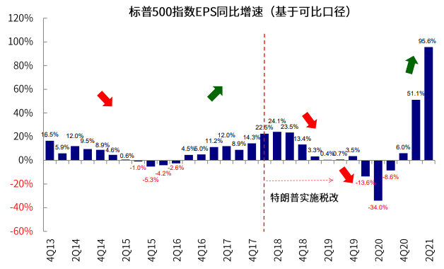 图表: 可比口径下,二季度标普500指数EPS同比增长95.6%,较一季度的51.1%继续改善