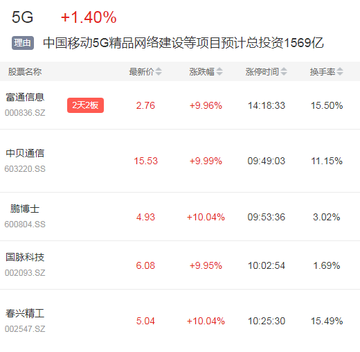今日5G板块震荡走高,富通信息连板,中贝通信、春兴精工等多股涨停。