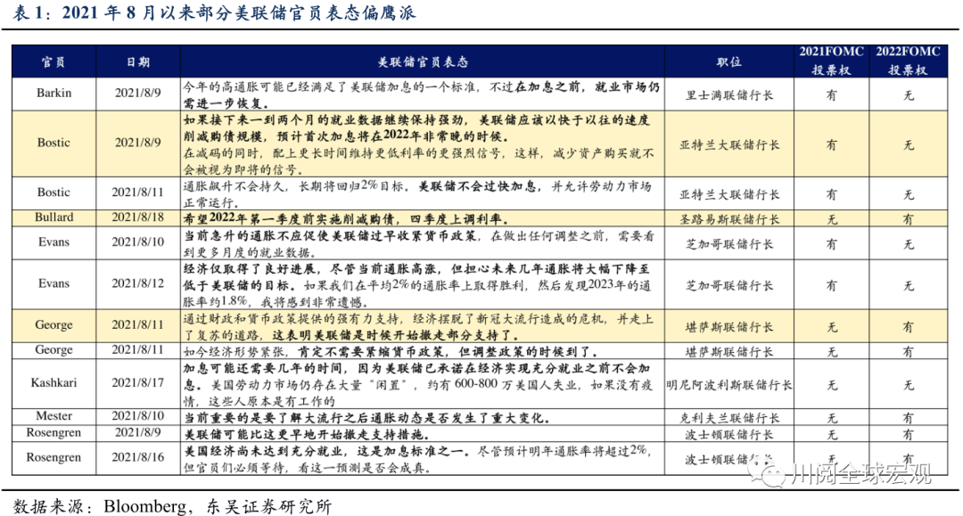 政策方面,2021年9月议息会议美联储可能在利率方面超预期鹰派,推升美元的升值。6月以来新冠变种毒株在美国加速扩散拖累经济复苏,联邦基金利率期货显示市场预期首次加息的时间为2023年3月,不过美联储部分官员近期表态偏鹰派(表1),意味着9月议息会议点阵图的首次加息时点有提前至2022年末的可能(从中值角度看)。回顾今年6月,美联储在利率方面的超预期鹰派曾使得美元指数跳升(图7)。