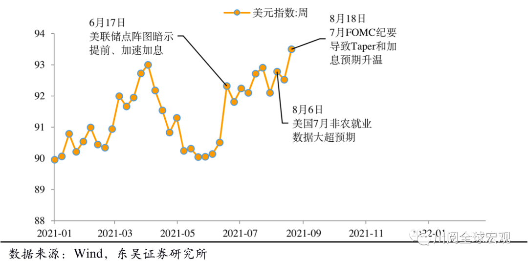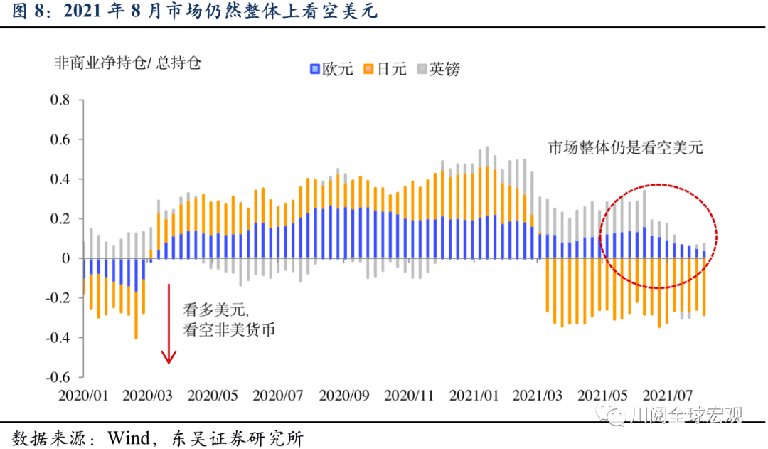 预期方面,与2013年不同,截至2021年8月市场整体仍是看空美元,可能是美元流动性过剩的论调让投资者放松了警惕,但这种情况下一旦出现超预期的变化,年内美元指数有可能进一步升至95附近。