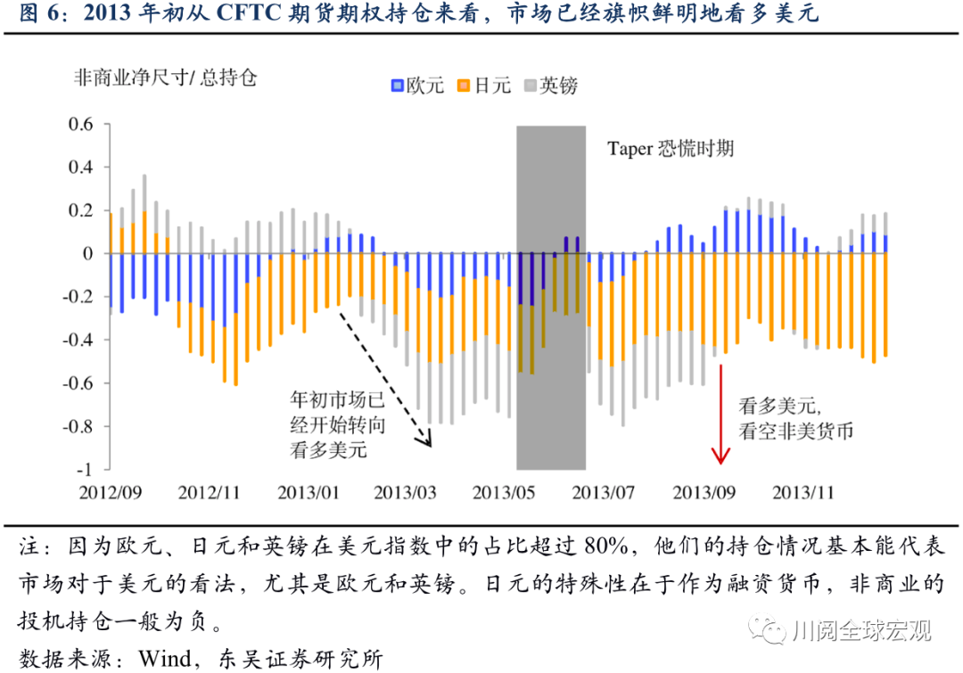 市场对于美元的强势已经有较为充分的预期是美元升值后劲不足的重要因素。从CFTC的外汇期货期权持仓来看,2013年初开始市场就旗帜鲜明地看多美元,这导致2013年下半年在Taper的刺激下美元多头的增仓动力和空间不足(图6)。